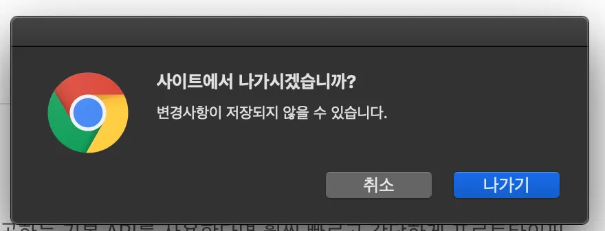 ์ฌ์ฉ์๊ฐ ํ์ด์ง๋ฅผ ๋ ๋๊ธฐ ์ ์ ํ์ธํ๋ ๊ฒฝ๊ณ ๋ฉ์ธ์ง๋ฅผ ๋์ธ ์ ์๋ค.