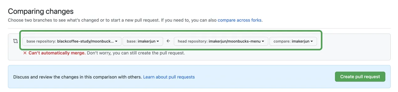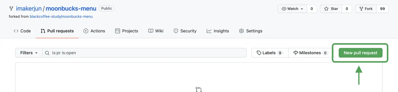 ⇒ blackcoffee-study/moonbucks-menu 의 imakerjun 브랜치로 pull request를 보내주세요. 만약 본인 브랜치가 없다면 메이커준에게 말씀해주세요