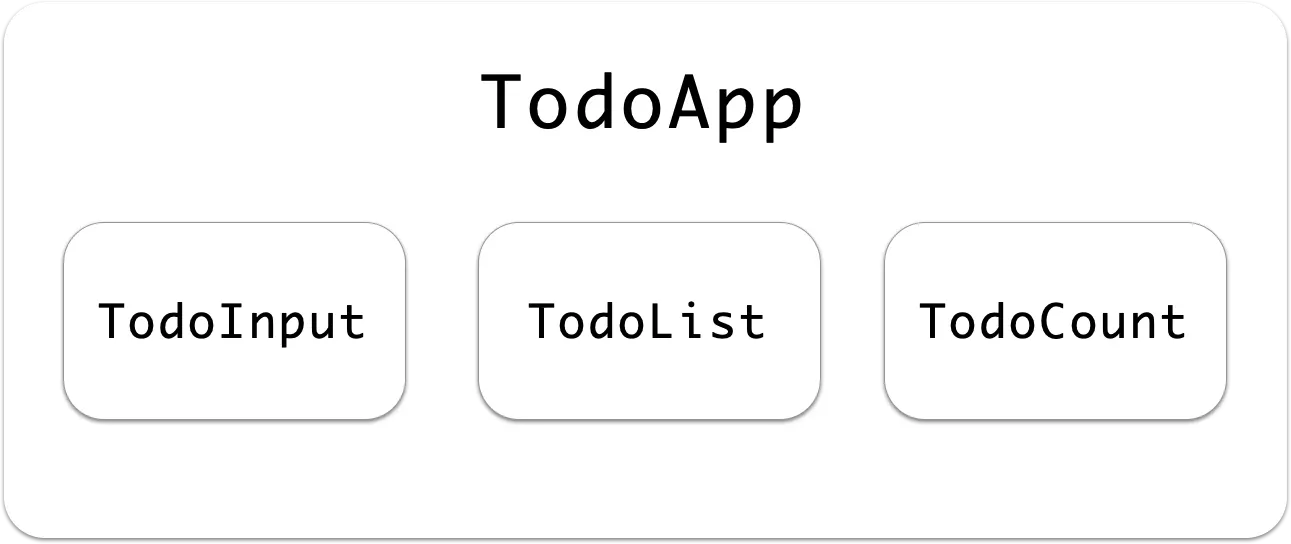 ๋ ์ธ๋ถ์ ์ผ๋ก ๋ถ๋ฆฌํ ์ ๋ ์์ง๋ง, ์ฐ์ ์ ์ด 4๊ฐ์ง๋ก ๋ถ๋ฆฌํด๋ณผ๊ฑด๋ฐ์. ์์ฒ๋ผ ๊ตฌ๋ถํ๊ณ ๋๋ฉด, TodoApp์ด๋ผ๋ ์ปดํฌ๋ํธ ์์ TodoInput, TodoList, TodoCount UI๋ค์ด ํฌํจ๋์ด ์์ต๋๋ค.